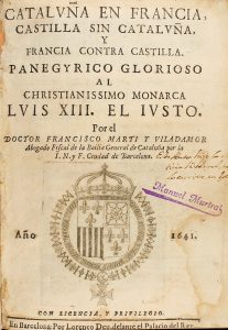 1641. (CATALUÑA). MARTI Y VILADAMOR, FRANCISCO: CATALUÑA EN FRANCIA, CASTILLA SIN CATALUÑA, Y FRANCIA CONTRA CASTILLA. PANEGYRICO GLORIOSO AL CHRISTIANISIMO MONARCA LUIS XIII. EL IUSTO. Barcelona: Lorenço Deu, 1641. 8º mayor. 13 h. + 426 p., 23...