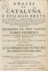 han florecido desde la primera población de España...hasta el presente de 1709. 3 volúmenes en folio menor impresos a 2 columnas. I: Barcelona: Joseph LLopis, 1709. 10 h., 364 p., 18 h. Cuenta los sucesos desde la primera población de España hasta el año 1163; II: Id.: Jaime Surià, 1709. 12 h., 504 p., 30 h. Contiene los sucesos desde el año 1163 hasta el 1458. III: Id.: Juan Pablo Martí, 1709. 11 h., 655 p., 26 h. Contiene los sucesos del año 1458 hasta el de 1709. Enc. en pergamino de época. Sello estampillado en portada. Ejemplar con algunas hojas levemente tostadas pero en general en buen estado de conservación. Palau 87471.