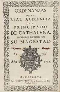 1742. (CATALUNYA). ORDENANZAS DE LA REAL AUDIENCIA DE EL PRINCIPADO DE CATHALUÑA, MANDADAS IMPRIMIR POR SU MAGESTAD. Barcelona: por Joseph Texidó, Impressor del Rey Nuestro Señor, 1742. Folio, 3 h., incluída la portada, orlada y con el escudo de...