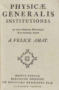 1797. AMAT, FELICE: PHYSICAE GENERALIS INSTITUTIONES AD USUM EPISCOPALIS BARCINONENSIS EDITAE. Barcinone: in Officina Bernardi Pla, 1797. 3 tomos en 1 vol. en 8º menor. I: 4 h. + 240 p., 1 lám. plegada; II: 4 h. + 219 p., 1 h., 3 láms. plegadas;...