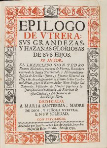 1730. (UTRERA). MELENDEZ, PEDRO ROMAN: EPILOGO DE UTRERA: SUS GRANDEZAS, Y HAZAÑAS GLORIOSAS DE SUS HIJOS. Sevilla: por Juan Francisco Blas de Quesada, Impressor Mayor de dicha Ciudad, 1730. 4º. 14 h., incluída la portada, en rojo y negro, y 1...