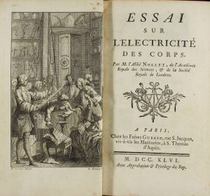 1746. NOLLET, JEAN ANTOINE: ESSAI SUR L´ELECTRICITE DES CORPS. Paris: chez les fréres Guerin, 1746. 8º. XX p. + 2 h. + 327 p. y vuelta. Frontis, dibujado por N. le Seur y grabado por R. Brunet, y 4 láminas plegadas, que contienen 15 figuras....