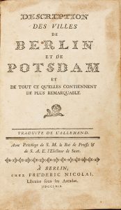 1769. (BERLIN-POSTDAM). DESCRIPTION DES VILLES DE BERLIN ET DE POSTDAM ET DE TOUT CE QU´ELLES CONTIENNET DE PLUS REMARQUABLE. Berlina: Frederic Nicolai, 1769. 8º. 10 h. + 622 p., 6 h., 2 planos plegados, uno de cada ciudad. Enc. rozada en plena...
