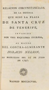 JULIO DE 1797. S.l.: s.i., 1798. 8º menor. 60 p. Enc. reciente en tela. Ex-libris manuscrito de anterior poseedor. Se narra el intento frustrado del almirante Nelson de conquistar la plaza de Tenerife para someter la isla a la corona británica. El ataque fue resistido bajo el mando del general Antonio Gutiérrez de Otero, entre los días 22 y 25 de julio de 1797.