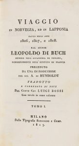 1817. (VIAJES-NORUEGA). BUCH, LEOPOLDO DI: VIAGGIO IN NORVEGIA, ED IN LAPPONIA FATTO NEGLI ANNI 1806, 1807 E 1808. Milano: dalla Tip. Sonzogno e Comp., 1817. 4 vols. 8º menor. I: XXXVI + 219 p., 4 láms.; II: 287 p., 4 láms.; III: 257 p., 5...