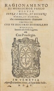 1560. (HUMANIDADES). RAGIONAMENTO DI MONSIGNOR PAOLO GIOVIO SOPRA MOTTI, ET DISEGNI D´ARME, ET D´AMORE, CHE COMMUNEMENTE CHIAMANO imprese con un Discorso di Girolamo Ruscelli. Venetia: appresso Giordano Ziletti, 1560. 8º menor. 8 h. + 216 p....