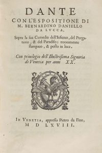 1568. (CLASICOS). DANTE CON L´ESPOSITIONE DI M. BERNARDINO DANIELLO DA LUCCA, ... In Venetia: apresso Pietro da Fino, 1568. 8º mayor. 13 p. + lámina grabada + 727 p. Capitales y cul-de-lampe a plena hoja. Enc. de época en pergamino.