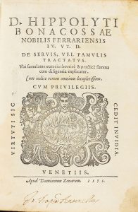 1575. (HUMANIDADES). D. HIPPOLYTI BONACROSSAE NOBILIS FERRARIENSIS IV. UT D. DE SERVIS, VEL FAMULIS TRACTATUS. Venetiis: apud Damianim Zenarum, 1575. 8º mayor. 8 h. + 56 fol., 21 fol., 3 h. Marca tipográfica en portada. Antigua señal de humedad....