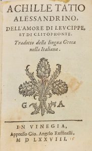 1578. (HUMANIDADES). ACHILLE TATIO ALESSANDRINO, DELLA´AMORE DI LEVCIPPE ET DI CLITOPHONTE. Vinegia: appresso Gio. Angelo Russinelli, 1578. 12º. 7 h. + 1 bl. + 111 fol. Enc. en pergamino.