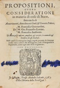 1583. (HUMANIDADES). PROPOSITIONI OVERO CONSIDERATIONI IN MATERIA DI COSE DI STATO, SOTTO TITOLO DI AVVERTIMENTI, AVVEDIMENTE CIVILI & CONCETTI POLITICI. Vinegia: presso Altobello Salicato, 1583. 8º menor. 8 h. + 156 fol. Grabado en portada y en la...