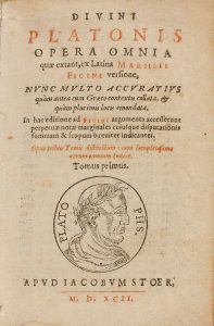1592. (HUMANIDADES). DIVINI PLATONIS OPERA OMNIA. Tomus primus. S.l.: apud Iacobum Stoer, 1592. 12º. 22 h. + 867 p., 8 h. Portada a dos tintas, viñetas, texto con apostillas marginales. Subrayados manuscritos. Enc. semidesprendida, en pergamino.