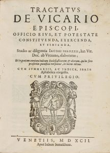 1592. (RELIGION). BROZII, IACOBI: TRACTATUS DE VICARIO EPISCOPI, OFFICIO EIUS, ET POTESTAE CONSTITUENDA, EXERCENDA, ET FINIENDA. Venetiis: apud Iulium Somaschum, 1592. 8º mayor. 30 h. + 163 fol. Grabado tipográfico en portada. Texto a dos...