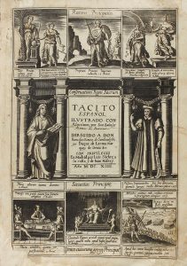 1614. (HUMANIDADES). ALAMOS DE BARRIENTOS, BALTASAR: TACITO ESPAÑOL ILUSTRADO CON AFORISMOS. En Madrid: por Luis Sanchez a su costa y de Iuan Hasrey, 1614. 4º mayor. 16 p. + 1003 p., 100 p. aprox. Portada con orla ilustrada. Viñetas, capitales y...