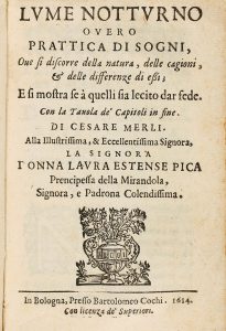 1614. MERLI, CESARE: LUME NOTTURNO OVERO PRATTICA DE SOGNI DUE SI DISCORRE DELLA NATURA, DELLE CAGIONI, & DELLE DIFFERENZE DI ESSI. Bologna: presso Bartolomeo Cochi, 1614. 8º menor. 179 p., 2 h. Viñetas. Enc. en pergamino.