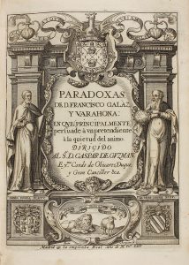 1625. GALAZ Y VARAHONA, FRANCISCO: PARADOXAS DE... EN QUE (PRINCIPALMENTE) PERSUADE A UN PRETENDIENTE A LA QUIETUD DEL ANIMO DIRIGIDO A GASPAR DE GUZMAN. Madrid: emprenta Real, 1625. 8º mayor. Portada grabada + 4 h. + 88 p. Texto enmarcado y a dos...