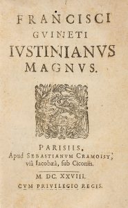 1628. (HUMANIDADES). GUINETI, FRANCISCI: IUSTINIANUS MAGNUS. Parisiis: apud Sebastianum Cramoisy, 1628. 8º. 16 h. + 219 p., 2 bl. [Sigue:] ORATIO. 7 p., 231-261 p. Enc. en pergamino, lomo rotulado.