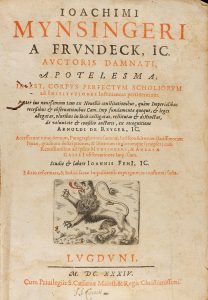 1634. (DERECHO). MYNSINGERI, IOACHIMI: IOACHIMI MYNSINGERI A FRUNDECK, IC. APOTELESMA, ID EST CORPUS PERFECTUM SCHOLIORUM AD INSTITUTIOES IUSTINIANEAS PERENENTIUM. Lugduni: s.i., 1634. 4º mayor. 10 h. + 854 p., 36 h. de índices. Texto a dos...