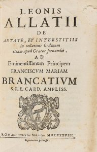 1638. (HUMANIDADES). ALLATI, LEONIS: LEONIS ALLATII. DE AETATE, ET INTERSTITIIS IN COLLATIONE ORDINUM ETIAM APUD GRAECOS SERUANDIS. Romae: exc. Mascardus, 1638. 8º. 8 h. + 224 p. Papel algo tostado. Muy pequeña pérdida en una esquina de la...