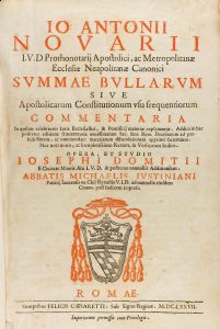1677. (RELIGON). DOMITII, IOSEPHI: IO. ANTONII NOVARII SUMMAE BULLARUM SIVE APOSTOLICARUM CONSTITUTIONUM USU FREQUENTIORUM COMMENTARIA. Romae: Felicis Caesaretti, 1677. Folio menor. 8 h. + 600 p., 87 h., 19 p. Portada a dos tintas. Texto a dos...