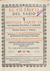 1681. (HUMANIDADES). GARAU, FRANCISCO: EL OLIMPO DEL SABIO INSTRUIDO DE LA NATURALEZA Y SEGUNDA PARTE DE LAS MAXIMAS POLITICAS Y MORALES. Barcelona: Imp. Antonio Ferrer, 1681. 8º mayor. 12 h. + 512 p., 9 h. Portada orlada y a dos tintas. Enc. de...