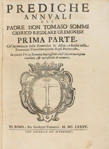 1685. (RELIGION). PREDICHE ANNUALI DEL PADRE DON TOMASO SOMMI CHERICO REGOLARE CREMONESE. Roma: per Gioseppe Vannaci, 1685. 2 vols. en 4º menor. I: 15 h. + 812 p.; II: 8 h. + 669 p., 20 h. Enc. en pergamino.