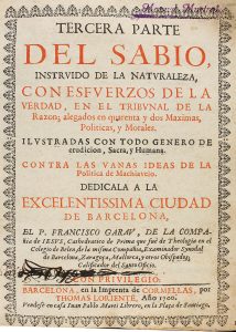 1700. (HUMANIDADES). GARAU, FRANCISCO: TERCERA PARTE DEL SABIO INSTRUIDO DE LA NATURALEZA CON ESFUERZOS DE LA VERDAD, EN EL TRIBUNAL DE LA RAZON. Barcelona. Imp. de Cormellas, 1700. 8º mayor. 5 h. + 531 p., 6 h. Bellas viñetas grabadas al cobre....