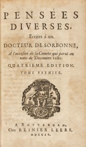 1704. (FILOSOFIA). PENSEES DIVERSES. Rotterdam: chez Reinier Leers, 1704. 3 tomos en 1 vol. con paginación correlativa. 616 p., 9 h. Enc. en plena piel, nervios, tejuelo, lomo cuajado. [Más:] CONTINUATION DES PENSEES DIVERSES OU REPONSE A...