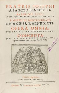 1755. (RELIGION-MONTSERRAT). SANCTO BENEDICTO, JOSEPHI: OPERA OMNIA TUM LATINO, TUM HISPANO SERMONE CONSCRIPTA... Gerundae: Typis Antonii Oliva, 1755. 4º mayor. Portada + retrato del autor + 26 h. + 430 p., 3 h. Portada a dos tintas con un grabado...