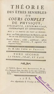 vols. [Más:] PRINCIPES DU CALCUL ET DE LA GEOMETRIE: OU COURS COMPLET DE MATHEMATIQUES ELEMENTAIRES. Tome premier. Le calcul. Id.: chez Alexander Jombert, 1783. [Más:] ID.: THEORIE DES ETRES SENSIBLES OU COURS COMPLET DE PHYSIQUE. Id.: chez Barrois, 1788. 2 vols. Enc. homogenea en pergamino, tejuelo.
