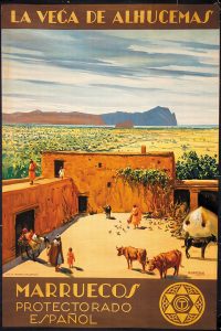 1939 ca. (TURISMO). BERTUCHI, M.: LA VEGA DE ALHUCEMAS. MARRUECOS PROTECTORADO ESPAÑOL. Valencia: Lit. Dura. Litografía. 100x66 cm. (39,5x26 in.). B -. Rasgaduras en los márgenes sin pérdida.
