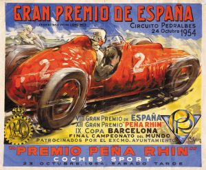 1954. (AUTOMOVILISMO). GARCIA, A.: GRAN PREMIO DE ESPAÑA. Circuito Pedralbes 1954. PREMIO PEÑA RIHN. Litografía. 62x75 cm. (24,5x29,5 in.). B. Pequeñas faltas en las esquinas superiores y en la parte central del margen inferior.
