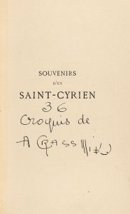 1880. MAIZEROY, RENE: SOUVENIRS D´UN SAINT-CYRIEN. Paris: Victor Harvard edit., 1880. 8º. XVI + 275 p. Ejemplar ilustr. a mano, plagado de dibujos originales coloreados que ilustran el relato, firmados por A. Crass. Enc. firmada por Creuzevault...