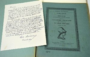 BÉRARD Léon [Sauveterre-de-Béarn, 1876 - Paris, 1960], avocat et homme politique français.Lettre autographe signée. 5 avril 1959 ; 1 page in-4°. Intéressante lettre Joints : Discours pour la réception de M. Léon Bérard à l’Académie...