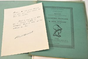 BONNARD Abel Pièce autographe signée. 1 page in-8. Joints : Discours pour la réception de M. Abel Bonnard à l’Académie Française au fauteuil de M. Le Goffic (16 mars 1933); diverses coupures de presse, notices biographiques et photographies...