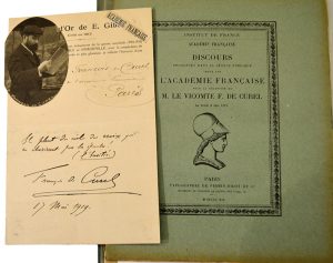 CUREL François de [Metz, 1854 - Paris, 1928], romancier et auteur dramatique français.Pièce autographe signée. 17 mai 1919 ; 1 page in-8. Joints : Discours pour la réception de M. le vicomte F. de Curel à l’Académie Française (8 mai 1919)...