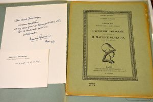 GENEVOIX Maurice [Decize, 1890 - Alsudia-Cansades, 1980], romancier français.Pensée autographe signée, adressée à M. Jouniaux. On joint son discours de réception à l’Académie française, dédicacé à M. Jouniaux