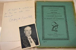 LACRETELLE Jacques de [Cormatin, 1888 - Paris, 1985], écrivain français.Pensée autographe signée. 1/2 page in-4On joint une carte de visite signée; son discours de réception à l’Académie française dédicacé à M. Jouniaux et des...