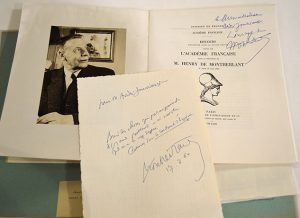 MONTHERLANT Henry Millon de [Paris, 1895 - id., 1972], écrivain français.Pensée autographe signée, adressée à M. Jouniaux. « Bien des choses qui paraissaient de grands problèmes ne le sont plus quand on a le nez dessus. » On joint son...