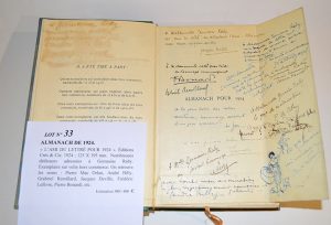 ALMANACH DE 1924.« L’AMI DU LETTRÉ POUR 1924 ». Éditions Crès & Cie. 1924 ; 125 X 195 mm. Nombreuses dédicaces adressées à Germaine Raby. Exemplaire sur velin hors commerce. On retrouve les noms : Pierre Mac Orlan, André Billy, Grabriel...