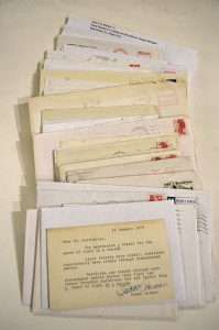 Pierre Bourgeade (1)- Robert Bréchon (1)- Jean Cau (1)- Claire Cayron (1), traductrice du portugais- William Cliff (2), immense poète belge- Jean Dutourd (1)- Dominique Fernandez (1)- Jean Fourastié (1)- Angelica Garnett (1), nièce de Virginia Woolf- René Garrigues (1), philosophe- René Huyghe (1 carte)- Philippe Jaccottet (2, même enveloppe)- Albert Kohn (2, même enveloppe), traducteur - Thomas Bernhard- Bernard Kreiss (1), traducteur Thomas Bernhard- Georges Lambrichs (1), à propos de Jacques Borel- Suzanne Lilar (1 carte)- Didier Martin (2), grand écrivain- Jean-Yves Masson (1)- Pierre Mertens (3), à propos de mon essai sur Thomas Bernhard- René Micha (3), critique d’art- Gérard Mortier (2, même enveloppe), directeur d’opéra- Jean-Michel Nectoux (3, même enveloppe), musicologue- Jean-Baptiste Niel (1)- Bernard Noël (4)- Michel Onfray (1)- Benoît Peeters (1), éditeur, essayiste- Jean-Claude Pirotte (1), à propos de Jacques Borel- Bertrand Poirot-Delpech (2, même enveloppe)- Henri Raynal (1), critique d’art- Jacques Réda (1)- Georges Roditi (6 cartes, 4 enveloppes)- Pierre Rosenberg (1), directeur du Louvre- Clément Rosset (1)- Jean Roudaut (1)- Ernesto Sábato (1), écrivain argentin- Michel Schneider (1), musicologue- Michel Seuphor (1)- Tsvetan Todorov (2), critique littéraire- Jean-Loup Trassard (1 carte vue, photo de l’artiste, sous enveloppe)- Pol Vandromme (2 cartes, même enveloppe), critique littéraire.