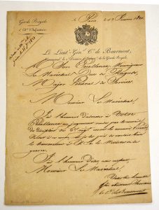 BOURMONT Louis-Auguste Victor, comte de Ghaisne de [château de Bourmont, 1773 - id., 1846], maréchal de France.Lettre signée, adressée au maréchal duc de Raguse. Paris, le 19 janvier 1821 ; 1 page in-folio, avec vignette et en-tête « Garde...