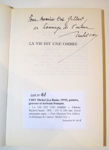 CIRY Michel [La Baule, 1919], peintre, graveur et écrivain français. « LA VIE EST UNE OMBRE ». Éditions Buchet/Chastel. 1992 ; 155 X 240 mm. Envoi autographe signé :