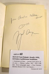 DAYAN Yael [Nahalal (Israël), 1939], écrivaine et politicienne israélienne.« Lieutenant au Sinaï — journal d’une guerre de six jours ». Éditions Laffont. 1967 ; 140 X 200 mm. Envoi autographe signé : « Pour Christian Melchior-Bonnet...