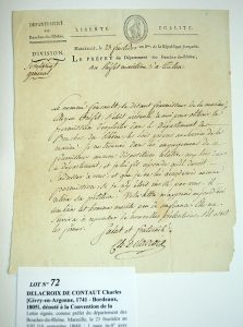 DELACROIX DE CONTAUT Charles [Givry-en-Argonne, 1741 - Bordeaux, 1805], député à la Convention de la Marne, père du peintre Eugène Delacroix.Lettre signée, comme préfet du département des Bouches-du-Rhône. Marseille, le 23 fructidor an VIII...