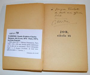 FARRÈRE Claude (Frédéric-Charles Bargone, dit) [Lyon, 1876 - Paris, 1957], écrivain français.« JOB, siècle XX ». Éditions Flammarion, Paris, 1949 ; 120 x 185 mm, broché (petite épidermure sur le plat de la couverture). Envoi autographe...
