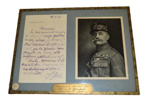 FOCH Ferdinand [Tarbes, 1851 - Paris, 1929], maréchal de France. Lettre autographe signée. 10 décembre 1926 ; 1 page in-8°. En-tête imprimé à son nom. Lettre encadrée sous verre avec un portrait.