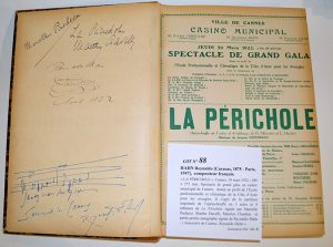 Côte d’Azur pour les aveugles. Il s’agit de la partition imprimée de l’opéra-bouffe en 3 actes et 4 tableaux de La Périchole signée par Marcelle Pacheco, Marthe Davelli, Maurice Claudius et petite portée autographe signée de Reynaldo Hahn : « Souvenirs de Cannes. Reynaldo Hahn ».