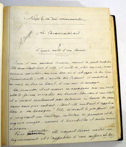 achevé le 23 à 1 h. du matin. » 282 pages in-8°, montées sur onglets dans une reliure en maroquin bleu nuit (22 x 18 cm), plats décorés avec des jeux de règles dorées reliant des fers dorés aux coins, dos lisse avec la reprise du même jeu de fers encadrant auteur, titre, double jeu de fers sur la tranche des plats, plats intérieurs avec le même jeu de fer en dentelle, reliure signée Joly fils (dos légèrement passé). Publié chez Alphonse Lemerre en 1917.Le manuscrit se finit à la page 258. Sont rajoutés à la suite « Première version des derniers chapitres », avec la pagination : 188 à 212 (Chapitre XII, « La reprise ».
