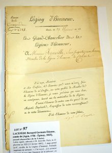 LACÉPÈDE Bernard Germain Étienne, comte de [Agen, 1756 - Épinay, 1825], grand chancelier de la Légion d’honneur, naturaliste et homme politique français.Lettre signée, adressée à M. Joinville. Paris, le 23 pluviôse an XIII [12 février...