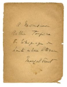 PROUST Marcel[Paris, 1871 - id., 1922], écrivain français.Pièce autographe signée. 1 page in-8°. Page de dédicace « À Monsieur Arthur Toupine, en témoignage de haute estime littéraire. Marcel Proust ».